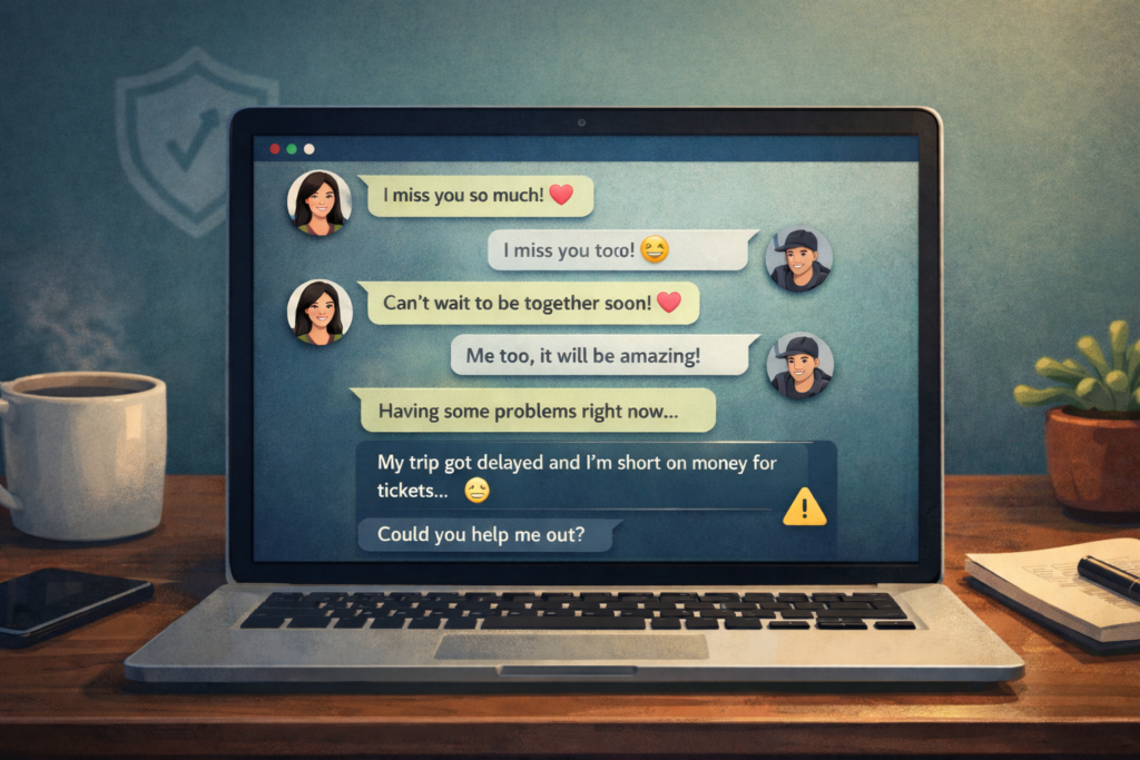 An online romance scam is a type of fraud where someone pretends to form a genuine romantic or emotional relationship in order to gain trust and eventually ask for money, financial help, or access to accounts. These scams often begin on dating apps, social media, or messaging platforms and can unfold slowly over weeks or months, making them especially difficult to recognize. The scammer’s goal is not a real relationship, but long-term access to a victim’s money or financial information.
